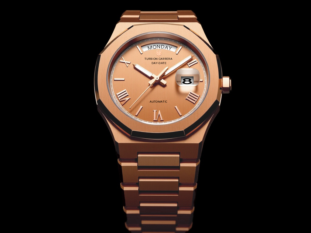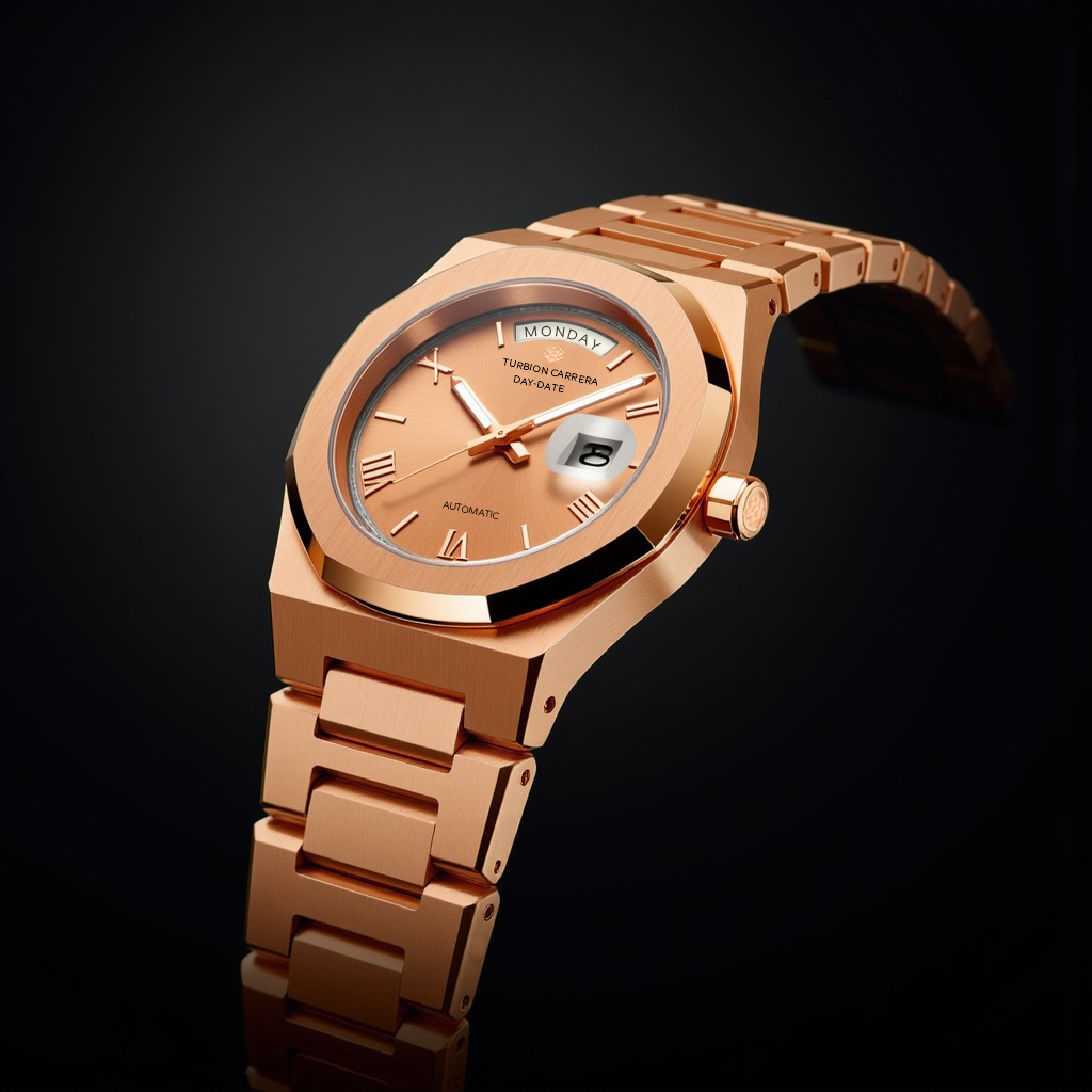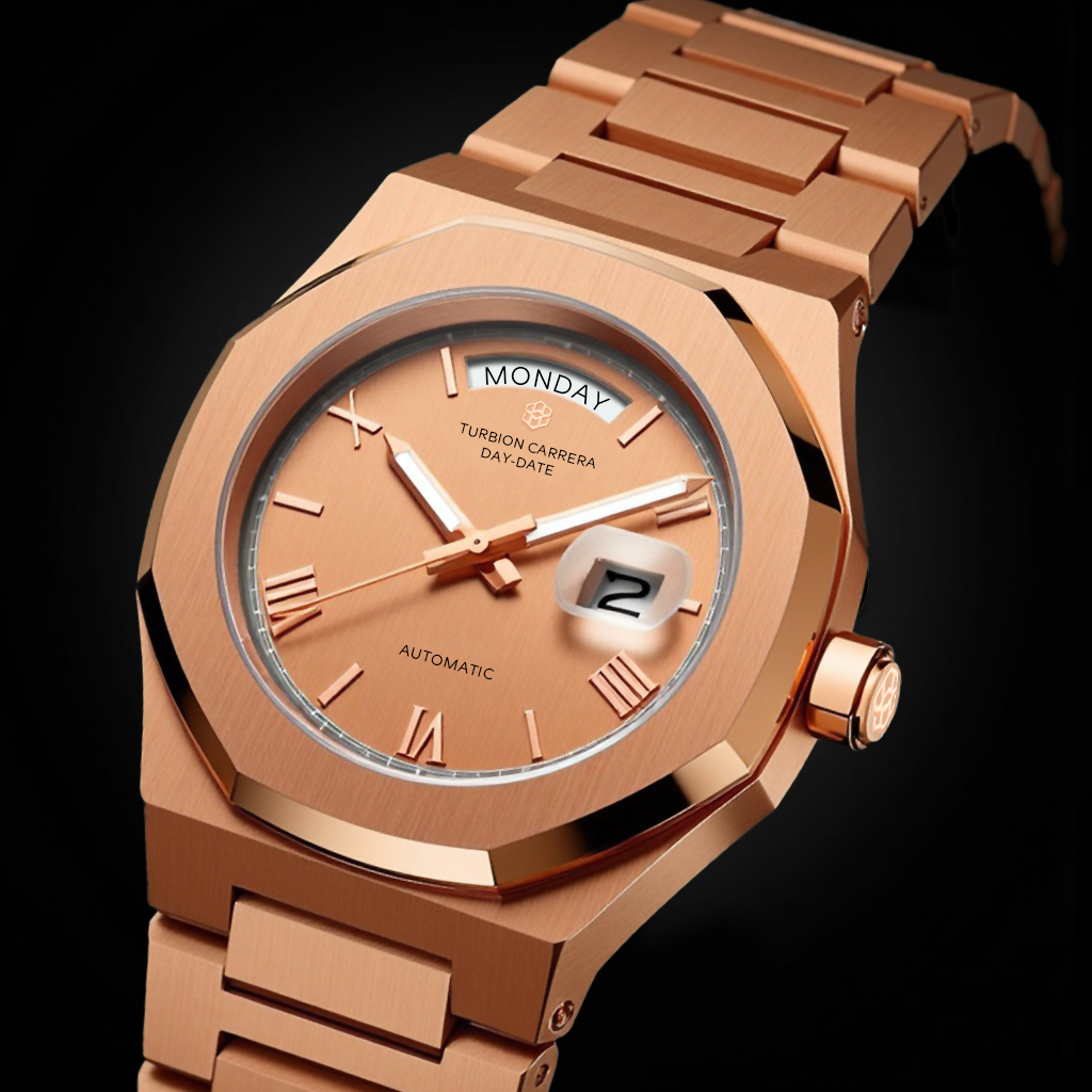 It’s time to go for rose gold with our automatic Day-Date watch. The brushed rose gold dial is met with rose gold-finished Roman numerals and watch hands, displayed through the luxurious Sapphire crystal. The geometric shape of the dial with its slim integrated lugs and Nautilus-inspired bracelet gives this watch a truly contemporary update.